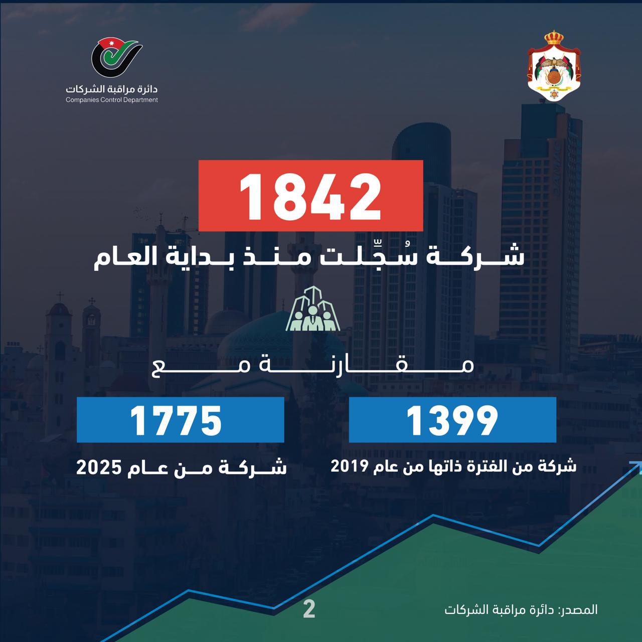 وبلغ عدد الشَّركات المسجَّلة خلال الشهور الثلاثة الأولى من عام 2026، بحسب إحصائيَّة دائرة مراقبة الشَّركات، 1842 شركة، مقارنة مع 1399 شركة خلال الفترة ذاتها من عام 2019، فيما بلغ عددها خلال الفترة ذاتها من عام 2025م 1775 شركة.