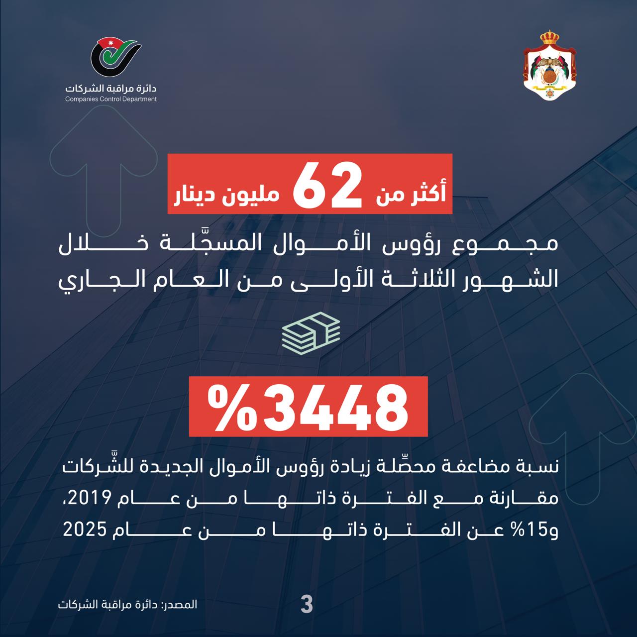 أكثر من 62 مليون دينار مجموع رؤوس الأموال المسجَّلة خلال الشهور الثلاثة الأولى من العام الجاري.