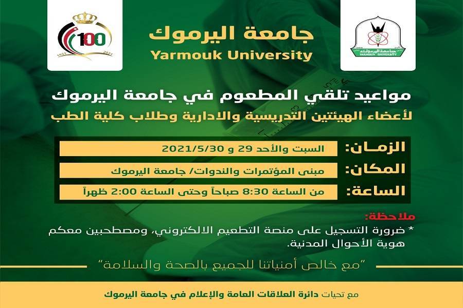 اليرموك تبدأ حملة التطعيم ضد فيروس كورونا لمنتسبيها ولكليتي الحصن واربد الجامعيتين السبت
