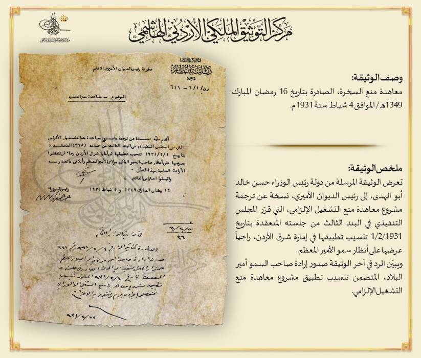 التوثيق الملكي يعرض وثيقة تبرز اهتمام الدولة بحقوق العمّال عام 1931