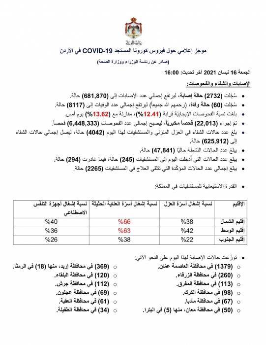 الصحة : تسجيل 2732حالة إصابة و 60 حالة وفاة
