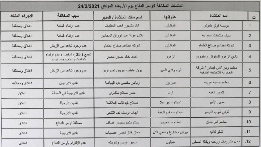 اغلاق 12 منشأة بالعاصمة واربد والبلقاء وعجلون وجرش